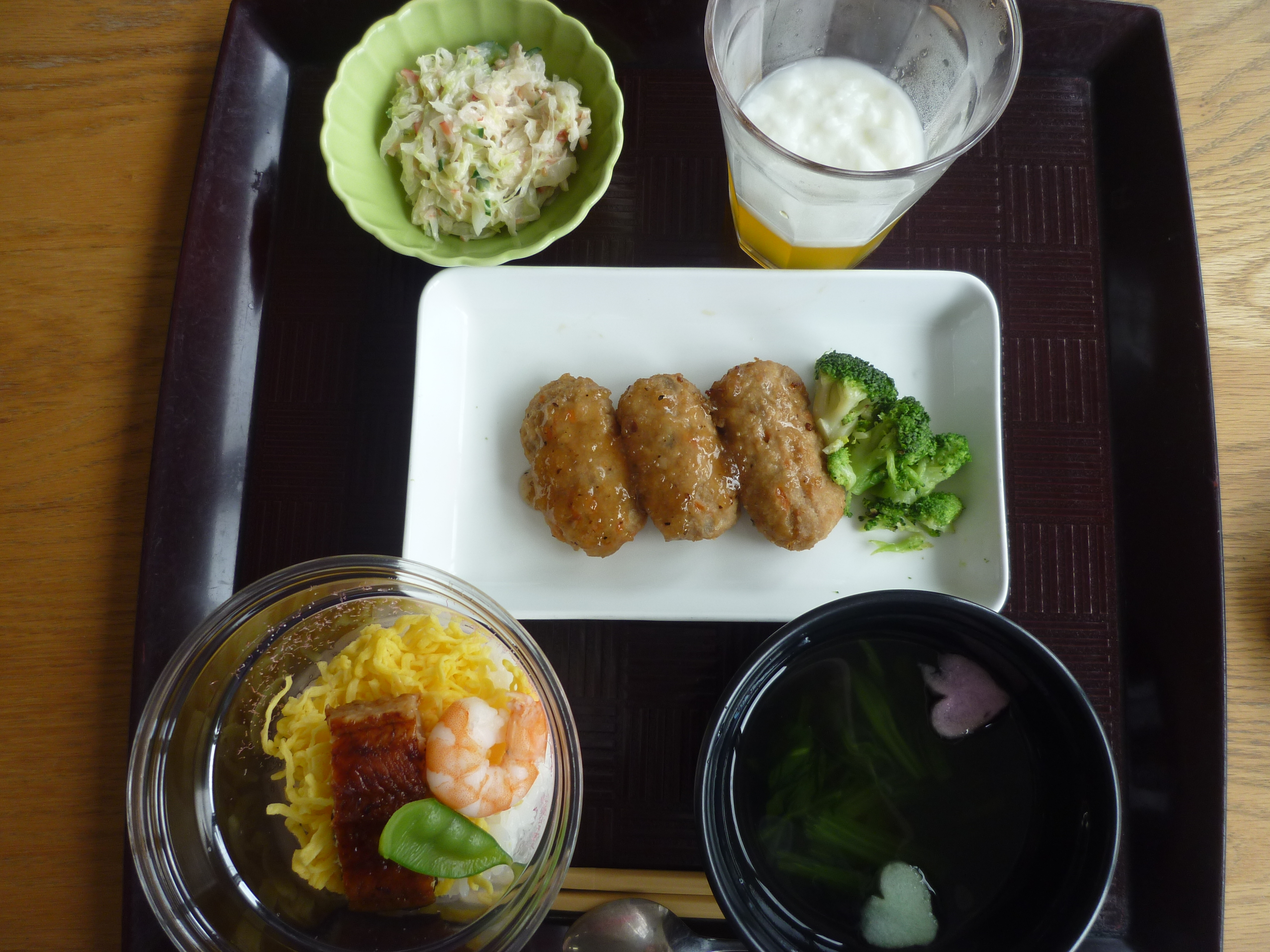 ☆鰻のカップ寿司 ☆ハートの麩入り♡すまし汁 ☆つくね塩だれ焼き ☆カニ風味サラダ ☆ビール風ゼリー(マンゴーゼリーとパンナコッタ)