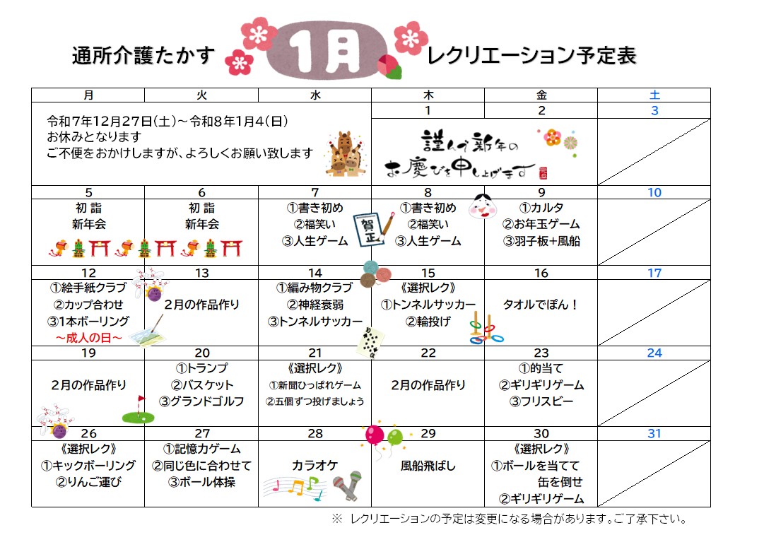 1月のレクリエーション予定表